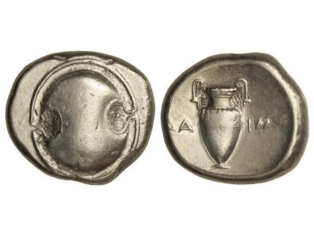 Estátera. - BEOCIA. TEBAS. - Anv.: Escudo beocio. Rev.: Ánfora entre A-I//. 12,10 grs. AR. (Pequeñas oxidaciones limpiadas en anverso). Se-2395 var. EBC-/EBC. - -