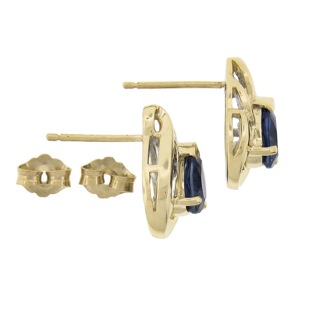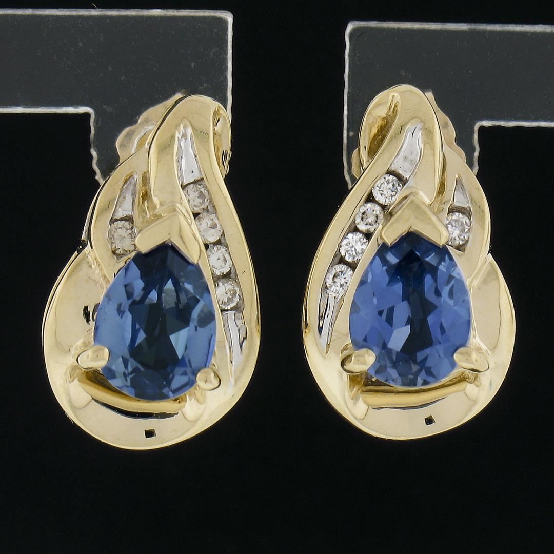 A solid 10k yellow gold teardrop earrings, with 2 pear cut blue stones (7.8x4.9mm each), and 10 round cut natural diamonds (I/J - SI1/SI2 ; 0.10ctw). The earrings measure approximately 15x9mm and weigh a total of 3.8 grams.