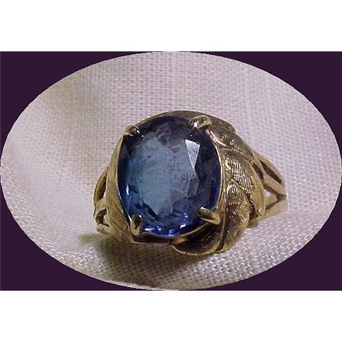 Esate 10K Gold Ring with Georgous Large Blue Stone. I assume that is it is a blue topaz or perhaps a sapphire. In any event it is big and showy set in a wonderful 10K leaf pattern setting. The size is a 9. This could be either a man's pinky ring or a woman's ring. The condition is excellent although the stone needs some cleaning.