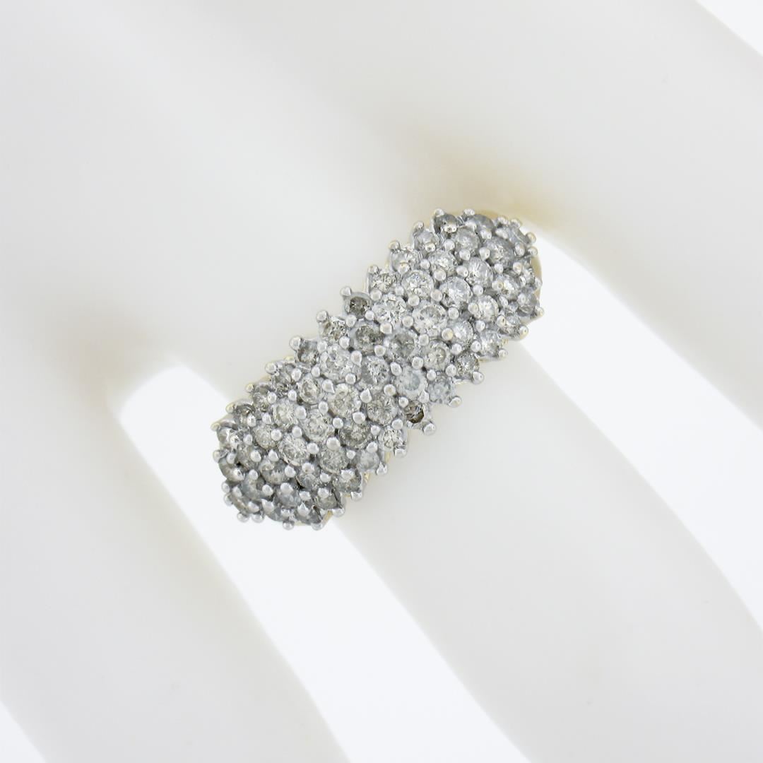 A solid 10k yellow & white gold 5 row ring, with 50 round cut natural diamonds (G-I - I2/I3 ; 1.0ctw). The ring is size 6.5, weighs a total of 3.21 grams, and measures 8.4mm wide.