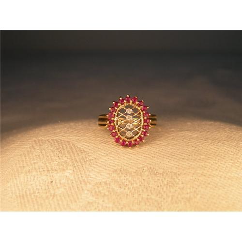 You are looking at an estate 14K yellow gold ruby and diamond ring. There are 4 brilliant round diamonds and 21 natural round rubies. The top of the ring measures a bit over 1/2 of an inch wide by 3/4 of an inch long. It is a size 7. Sizing is available. This ring weighs 4.2 grams. It is in mint condition.