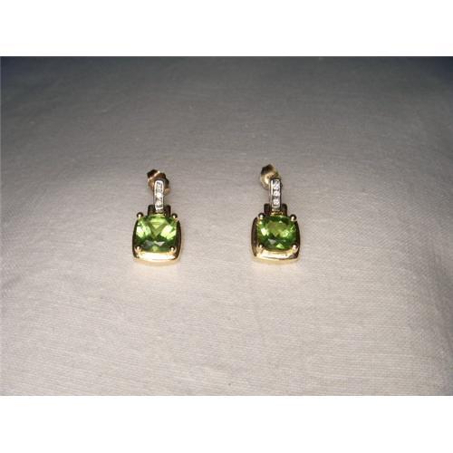 You are looking at a pair of 14K 2-tone gold peridot and diamond earrings. Each earring features one square natural peridot wih 6 mm sides and 3 brilliant round diamonds. Each earring measures 5/8 of an inch long by 3/8 of an inch wide. The pair weighs 4.1 grams. They are in mint condition.