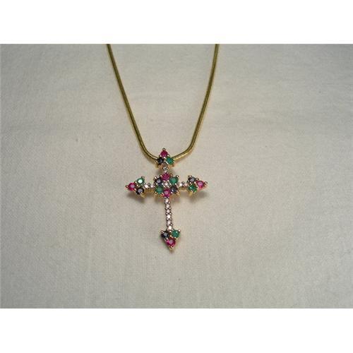 <tr><td>Title:Estate 14K Diamond Ruby Sapphire Cross Pendant</td></tr>
