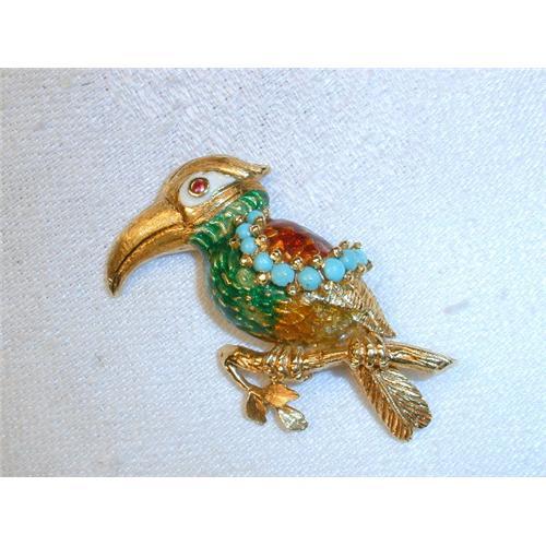 <tr><td>Title:Estate 14K Enamel Ruby Turquoise Parrot Brooch </td></tr>