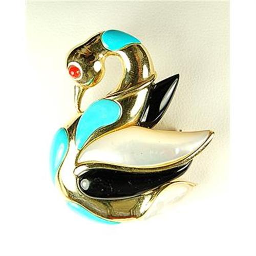 ESTATE 14k Yellow Gold Pin of a SWAN featuring Turquoises, Mother of Pearl, and Black Onyx with a Coral eye. This VERY WELL made pin measures 1 3/4" x 1 1/2" and it is SIMPLY STUNNING!