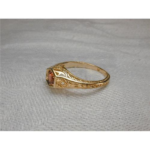 You are looking at a beautiful 14K gold ring with pink tourmaline and diamonds. The natural round pink tourmaline in a delicate yellow gold filligree design measures 5 mm in diameter. There are 4 brilliant round diamonds, decorating each of the 4 sides of the filigree. Each diamond measures less than 1 mm in diameter. The top of the ring measures 1/4 of an inch wide. This ring is a size 7. Sizing is available. It weighs 2.8 grams. It is in mint condition.
