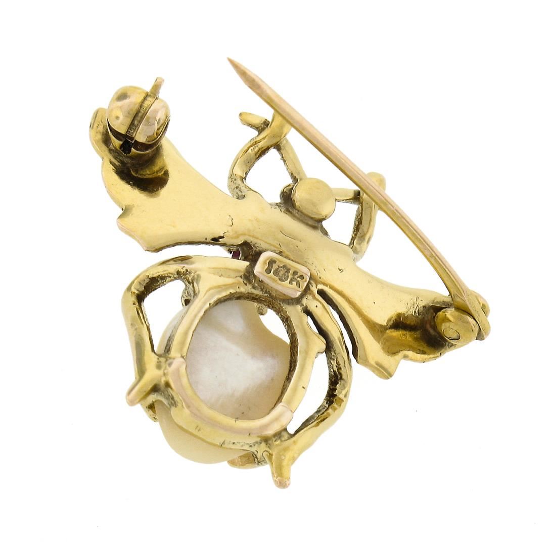 a solid 14k yellow gold bee brooch. with 1 oval cut natural spinel (0.30ct ), and 1 baroque shape cultured pearl (9.8x7.8mm). Measures 20.60x23.80mm and weighs a total of 3.73 grams.