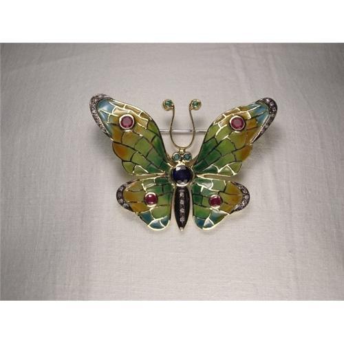 You are looking at an estate 14K yellow gold gemstone butterfly brooch. The wings are multi-colored plique a jour enamel and contain 4 rubies, 1 sapphire, and 28 brilliant round diamonds. All gemstones are natural. The piece measures 1 and 1/8 of an inch in length by 2 and 1/4 of an inch in width. The piece weighs 16.3 grams. It is in mint condition.