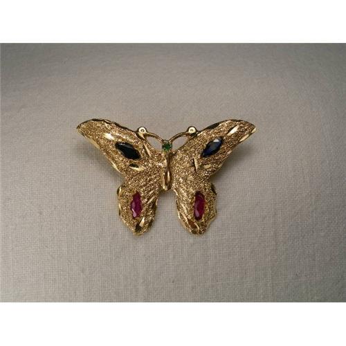 You are looking at an estate 14K yellow gold butterfly brooch with rubies, emeralds and sapphires. This uniquely designed piece features 2 marquise shaped rubies, 2 marquise shaped sapphires and a round emerald. All gemstones are natural. The brooch measures a bit under 1.5 inches from side to side by one inch from top to bottom. The pin weighs 5.4 grams. It is in mint condition.