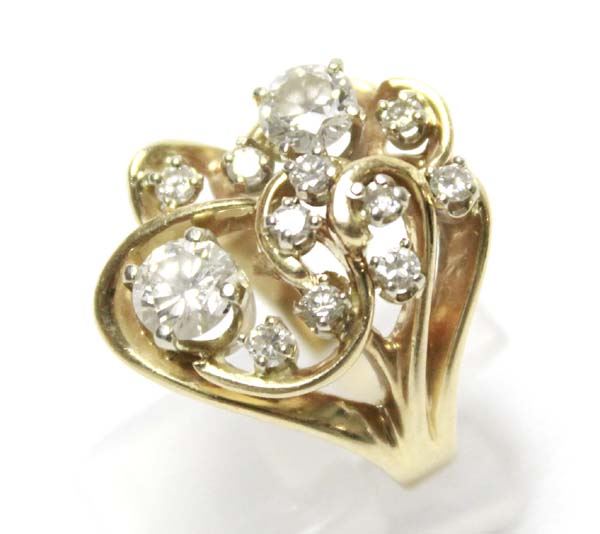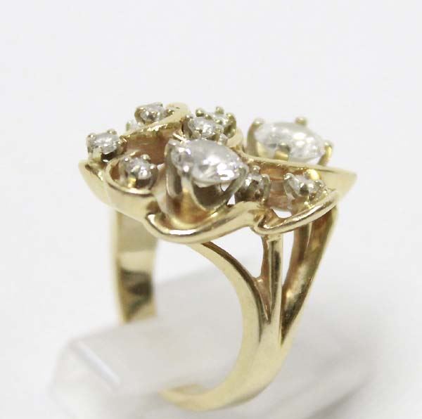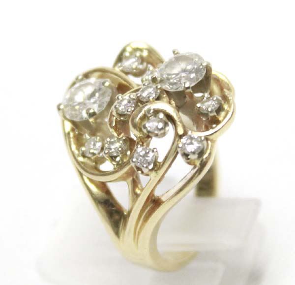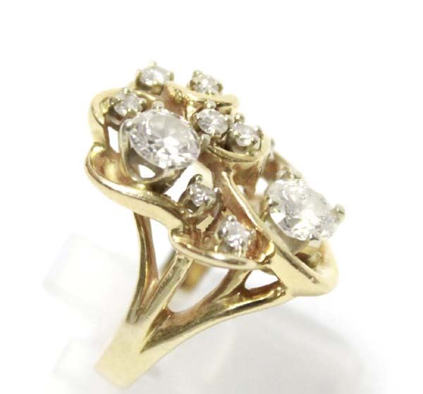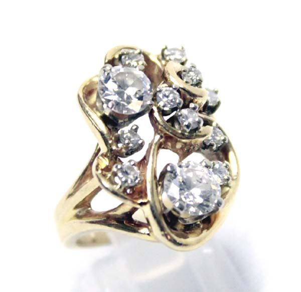 From the Posey Estate we have a 14K Gold and Diamond Ring custom made from several family heirloom diamonds. Ring is a Size 5.75, measures 1''L x .75''W, features 10 small and 2 large diamonds, 10.9g, stamped 14K, Classy! Elegant! Fabulous! A must have...