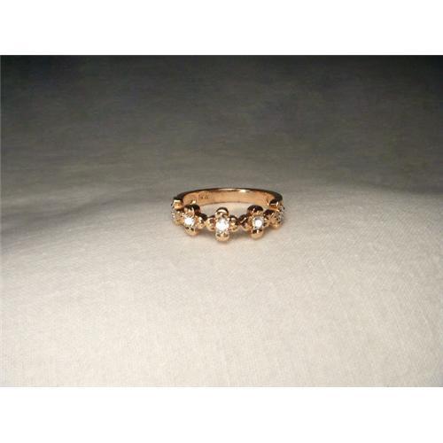 You are looking at an estate 14K pink gold diamond flower band. This lovely piece features 5 brilliant round diamonds measuring 3 mm each. The total weight of the diamonds is .25 of a carat. The band measures 1/4 of an inch wide. It is size 7. Sizing is available. The ring weighs 3.2 grams. It is in mint condition.