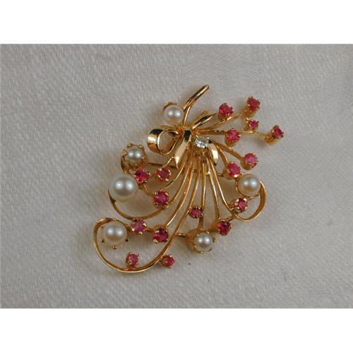 <tr><td>Title:Estate 14K Ruby Diamond Cultured Pearl Brooch</td></tr>