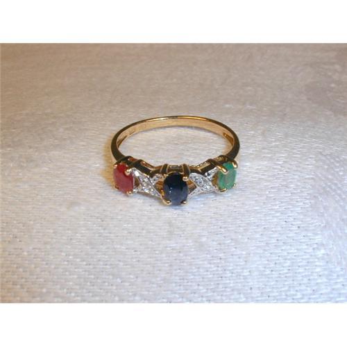 <tr><td>Title:Estate 14K Ruby Diamond Emerald Sapphire Ring</td></tr>