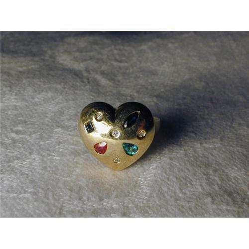 <table width="100%" border="0" cellspacing="0" cellpadding="4"><tr><td><em> </em></td></tr><tr> <td width="100%"> You are looking at an estate 14K yellow gold ruby sapphire emerald and diamond ring. All gemstones are natural. There are 2 sapphires, 1 emerald, 1 ruby and 4 diamonds in this beautiful heart shaped design. The top of the ring measures 5/8 of an inch wide by 3/4 of an inch long. It is a size 6.75. Sizing is available. This ring weighs 5.1 grams. It is in mint condition. </td></tr><tr> <td> </td></tr><tr> <td>Reference #: Zar_Ring_084</td></tr><tr><td>Condition:mint</td></tr><tr><td>Year:post-1945</td></tr><tr><td>Title:Estate 14K Ruby Sapphire Emerald Diamond Ring</td></tr><tr><td>Location:New York</td></tr></table>
