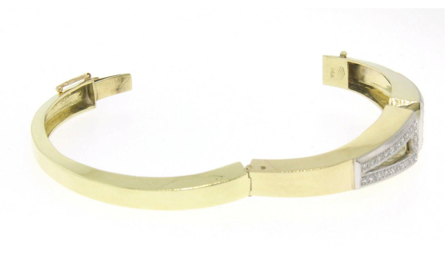 One 14k Yellow & White Gold 0.69ctw Pave Round Diamond Hinged Open Bangle Bracelet. Item Details: Material: Solid 14k White and Yellow Gold, Weight: 30.60 Grams, Stone(s): (46) Natural Genuine Diamonds - Round Brilliant Cut - Pave Set - F/G Color - VS1/VS2 Clarity - 0.69ctw (approx.), Length: Will comfortably fit a 6 inch wrist., Width: 13.67mm (at the top) - 6.25mm (at the bottom), Condition: Estate piece in like new condition