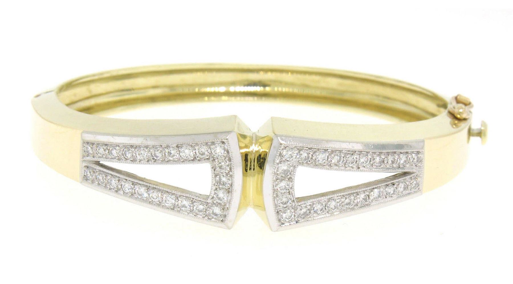 One 14k Yellow & White Gold 0.69ctw Pave Round Diamond Hinged Open Bangle Bracelet. Item Details: Material: Solid 14k White and Yellow Gold, Weight: 30.60 Grams, Stone(s): (46) Natural Genuine Diamonds - Round Brilliant Cut - Pave Set - F/G Color - VS1/VS2 Clarity - 0.69ctw (approx.), Length: Will comfortably fit a 6 inch wrist., Width: 13.67mm (at the top) - 6.25mm (at the bottom), Condition: Estate piece in like new condition