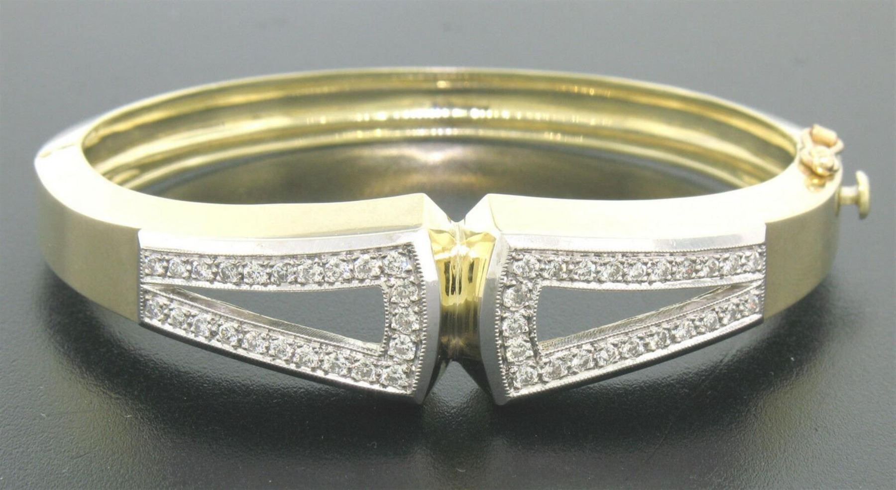 One 14k Yellow & White Gold 0.69ctw Pave Round Diamond Hinged Open Bangle Bracelet. Item Details: Material: Solid 14k White and Yellow Gold, Weight: 30.60 Grams, Stone(s): (46) Natural Genuine Diamonds - Round Brilliant Cut - Pave Set - F/G Color - VS1/VS2 Clarity - 0.69ctw (approx.), Length: Will comfortably fit a 6 inch wrist., Width: 13.67mm (at the top) - 6.25mm (at the bottom), Condition: Estate piece in like new condition