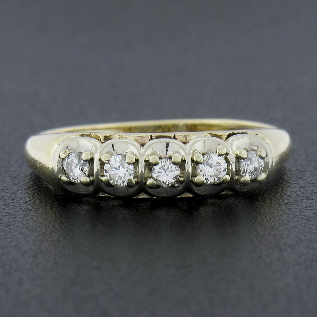A solid 14k yellow and white gold stack band ring, with 5 round cut natural diamonds (G/H - SI1/SI2 ; 0.18ctw). The ring is size 6.0, weighs a total of 2.03 grams, and measures 4.5mm wide.