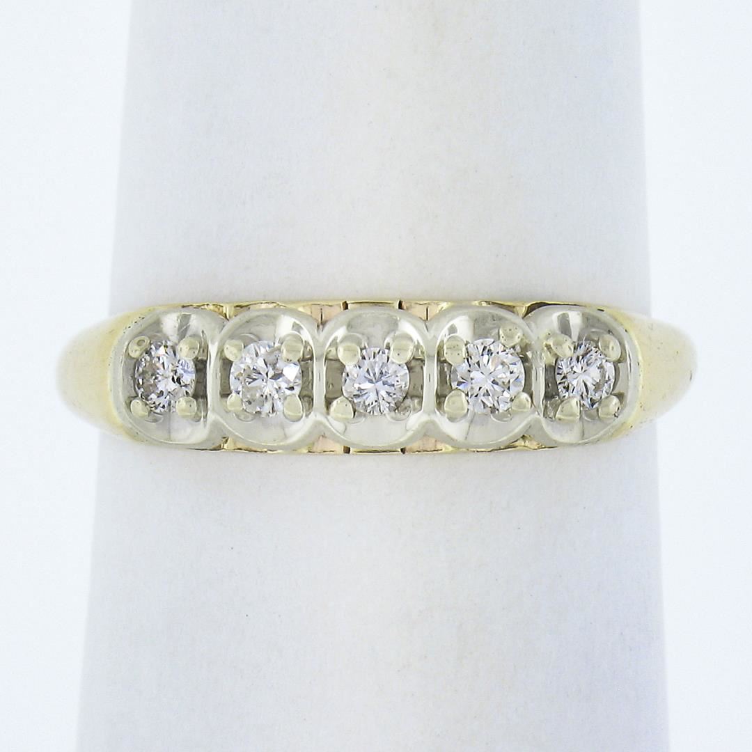A solid 14k yellow and white gold stack band ring, with 5 round cut natural diamonds (G/H - SI1/SI2 ; 0.18ctw). The ring is size 6.0, weighs a total of 2.03 grams, and measures 4.5mm wide.