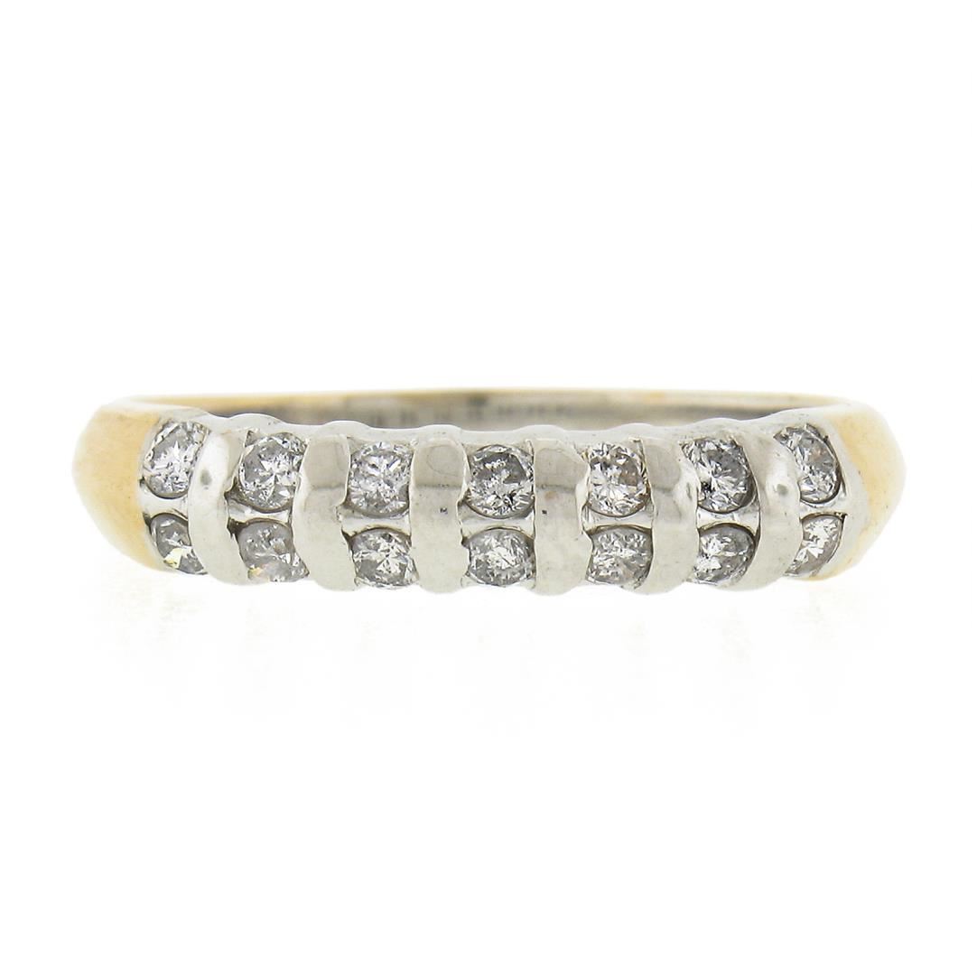 A solid 14k yellow & white gold band ring, with 14 round cut natural diamonds (H/I - SI2-I2 ; 0.30ctw). The ring is size 7.5, weighs a total of 3.02 grams, and measures 4.1mm wide.