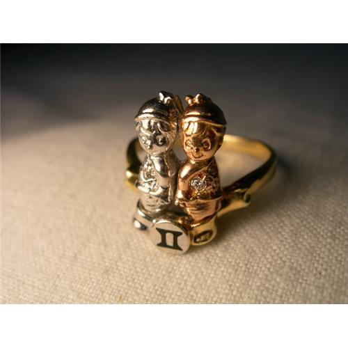 You are looking at an estate 14K tri-color gold twins diamond ring. The shank of the ring is yellow gold. One twin is in rose colored gold while the other is white, the zodiac sign for gemini sits in front of them. Each twin holds 3 brilliant round diamonds measuring about 1 mm in diameter each. The front of the ring measures 5/8 of an inch wide. The ring is a size 7.25. Sizing is available. It weighs 4.8 grams. It is in mint condition.