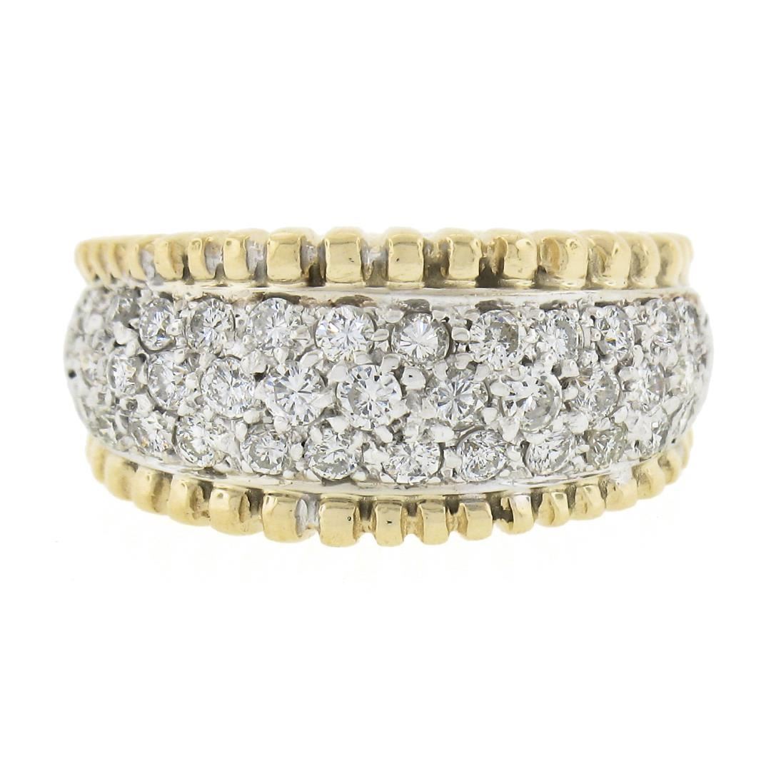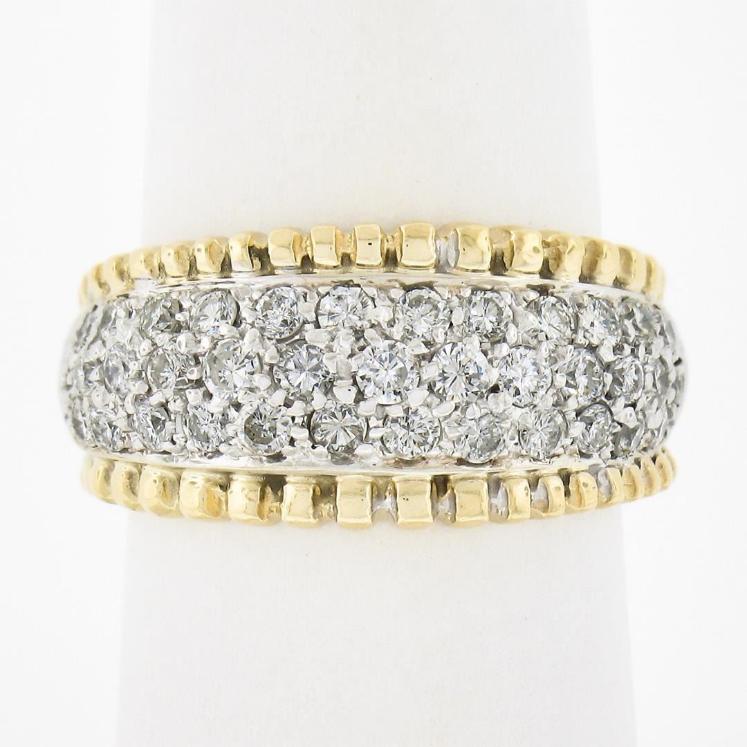 A solid 14k yellow & white gold band ring, with round cut natural diamonds (G-I - SI1/SI2 l; 1.0ctw). The ring is size 6.5, weighs a total of 4.22 grams, and measures 5.6mm wide.