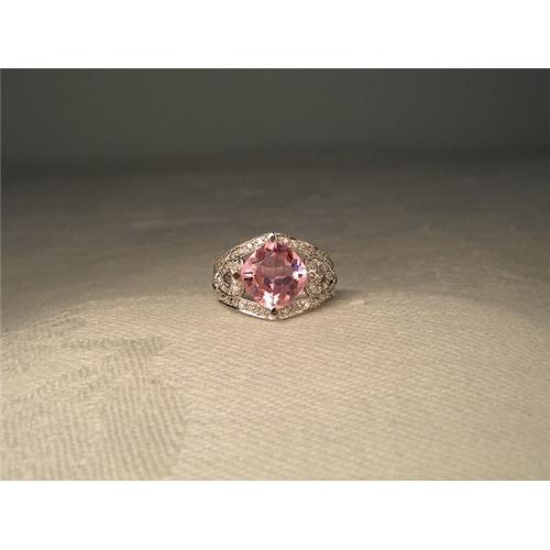 You are looking at a gorgeous 14K white gold ring with rose quartz and diamonds. The natural square shaped rose quartz measuring 8 mm by 8 mm, is surrounded by 44 brilliant round diamonds, each measuring less than 1 mm in diameter in a filigree heart design settings. The total weight of the diamonds is .25 of a carat. The top of the ring measures 5/8 of an inch at its widest point. It is a size 7. Sizing is available. This ring weighs 4.4 grams. It is in mint condition.