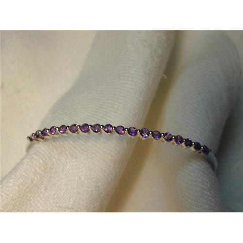 You are looking at a lovely estate 14K white gold bangle bracelet with amethyst. Each of the 18 natural amethyst stones measure 2 mm in diameter. The bracelet measures 2.5 inches from side to side and 2 inches from top to bottom. It can fit up to a 7.5 inch wrist. It weighs 6.6 grams. It is in mint condition.
