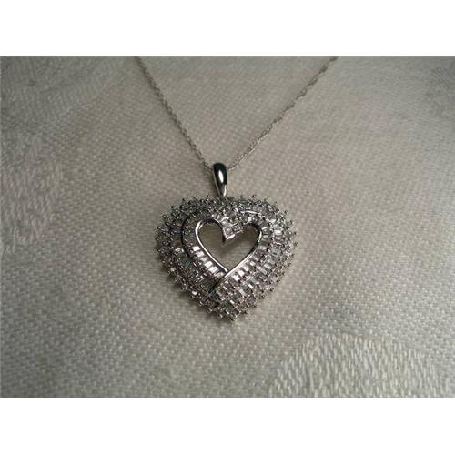 You are looking at a amazing estate 14K white gold heart pendant with diamonds. This beautiful piece features numerous brilliant round diamonds and baguette cubic zirconia. The pendant measures almost one inch long by 7/8 of an inch wide. It weighs 5.1 grams. It is in mint condition.