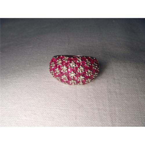 You are looking at an estate 14K white gold ruby and diamond ring. All gemstones are natural. There are 23 brilliant round diamonds totaling about 1/3 of a carat and 52 round rubies in this gorgeous piece. The top of the ring measures almost .50 of an inch in diameter. It is a size 7. Sizing is available. This ring weighs 6.1 grams. It is in mint condition.
