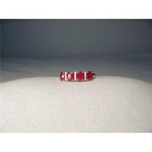 You are looking at an estate 14K white gold ruby and diamond ring. This beautiful piece features 4 natural oval rubies measuring 5 mm by 4 mm and 12 brilliant round diamonds measuring 1 mm each. The total weight of the diamonds is .10 of a carat. The total weight of the rubies is 1.75 carats. The band measures just over 3/16 of an inch wide. It weighs 3.3 grams. The ring is a size 7. Sizing is available. It is in mint condition.