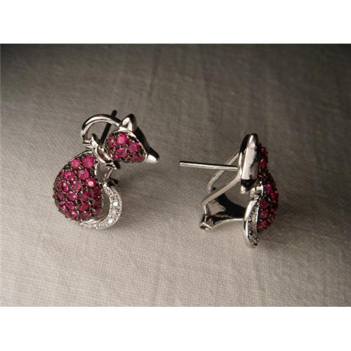 You are looking a pair of estate 14K white gold diamond and ruby cat earrings. Each earring contains 31 natural rubies and 8 brilliant round diamonds. Each earring measures 7/8 of an inch long by 3/8 of an inch wide. The total weight of the rubies in both earrings is about 1.42 carats. The pair weighs 6.2 grams. They are in mint condition.