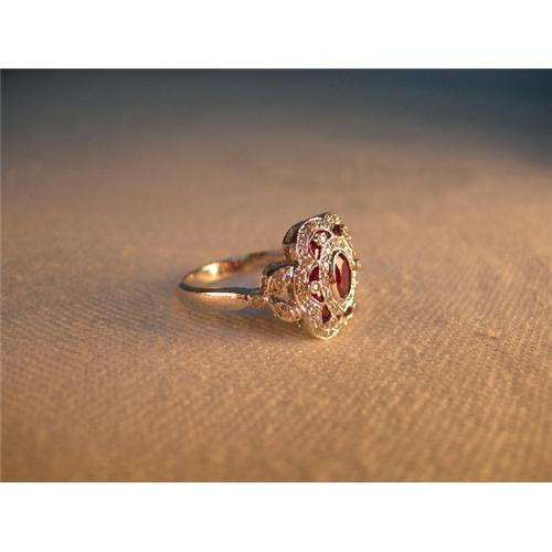 You are looking at an antique 14K white gold ruby and diamond mosaic ring. There are 12 smaller rubies and one large oval ruby in the center. Also there are 42 round diamonds encrusting the face of the ring. The oval ruby measures 5 mm long by 4 mm wide. All gemstones are natural. The rubies weigh a total of 1.15 carats and the diamonds weigh .18 carats. The top of the ring measures a bit over 1/2 of an inch wide by 1/2 of an inch long. The ring is a size 7.5. Sizing is available. It weighs 4.2 grams. It is in mint condition.