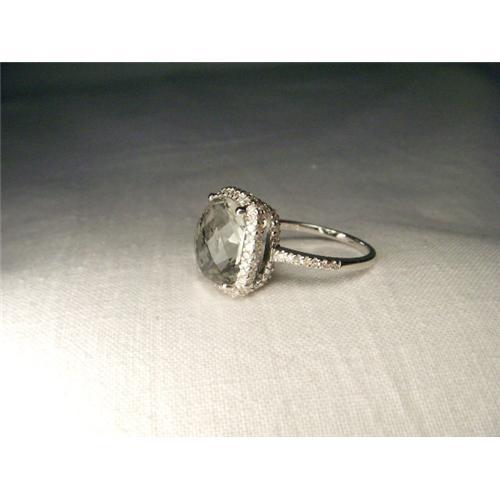 You are looking at a beautiful estate 14K white gold filigree ring with green amethyst and diamonds. The natural green amethyst measures 12 mm long by 10 mm wide. It is surrounded by multiple brilliant round diamonds, each measuring almost 1 mm in diameter in a micro pave setting. The total weight of the diamonds is .76 of a carat. The top of the ring measures a bit under 5/8 of an inch long by 1/2 of an inch wide. It is a size 7. Sizing is available. The ring weighs 4.2 grams. It is in mint condition.