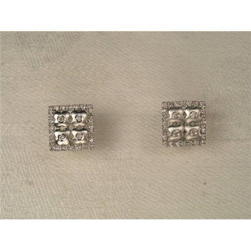 You are looking at a pair of estate 14K white gold square earrings with diamonds. Each earring features 4 brilliant round diamonds each measuring 1 mm in diameter in a beautiful flower design, surrounded by 24 round diamonds measuring a bit under 1 mm in diameter each. The total weight of the diamonds is .75 of a carat. Each earring measures 1/2 of inch long by 1/2 of an inch wide. The weight of the pair is 6 grams. They have french clip backs. They are in mint condition.
