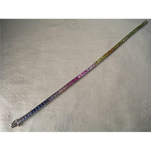 You are looking at an estate 14K white gold bracelet with multi-colored sapphires. All gemstones are natural. This beautiful piece features 64 princess cut multi-colored sapphires, each measuring 3 mm on each side. The bracelet measures 7 & 5/8 inches long by 1/8 of an inch wide. It weighs 11 grams. It is in mint condition.