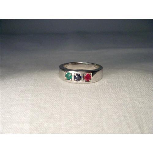 You are looking at an estate 14K white gold ruby, sapphire and emerald band. All gemstones are natural. This piece features one of each gemstone set into the front of the ring measuring 3 mm in diameter each. The top of this ring measures a bit over 1/8 of an inch wide. It is a size 7. Sizing is available. It weighs 5.5 grams. It is in mint condition.