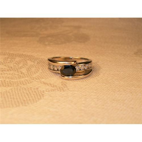You are looking at a beautiful estate 14K white gold band with sapphire and diamonds. This lovely piece features 1 natural oval sapphire measuring 6 mm long by 4 mm wide and 8 brilliant round diamonds each measuring 2 mm in diameter in a channel setting. The total weight of all the diamonds is .40 of a carat. The top of the ring measures a bit over 1/4 of an inch wide. It is a size 7.25. Sizing is available. The ring weighs 7.5 grams. It is in mint condition.