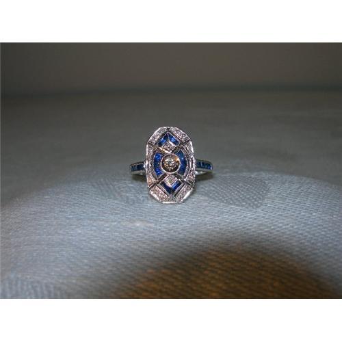 You are looking at an antique 14K white gold sapphire and diamond mosaic ring. There are 18 sapphires and one diamond in the center. Also there are 22 smaller round diamonds encrusting the face of the ring. The diamond measures 2 mm in diameter. All gemstones are natural. The sapphires weigh a total of .80 carats and the diamonds weigh .13 carats. The top of the ring measures 1/2 of an inch wide by 3/4 of an inch long. The ring is a size 7.25. Sizing is available. It weighs 4.8 grams. It is in mint condition.