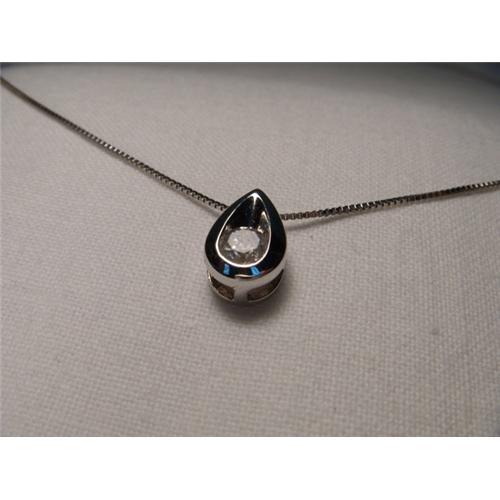 You are looking at a 14K white gold diamond drop necklace with a solitaire round diamond. This beautiful piece features a white gold diamond drop setting dangling at the base, inside of which there is a round diamond that weighs 1/3 of a carat. The drop setting measures 10 mm long by 7 mm wide. The length of the necklace is 19.5 inches and it has a lobster clasp. The piece weighs 2.5 grams. It is in mint condition.