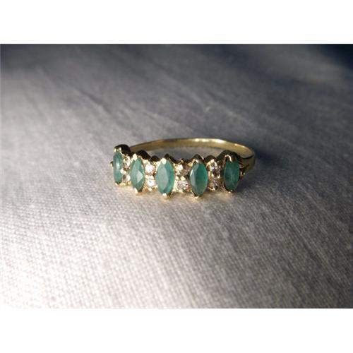 You are looking at an estate 14K yellow gold emerald and diamond band. Each of the 5 natural marquise emeralds measure 4 mm by 2 mm. There are 8 round diamonds in this beautiful piece. The ring measures 1/8 of an inch wide. It is a size 5.75. Sizing is available. It weighs 1.4 grams. It is in mint condition.