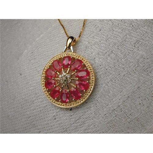 <table width="100%" border="0" cellspacing="0" cellpadding="4"><tr><td><em> </em></td></tr><tr> <td width="100%"> You are looking at an estate 14K yellow gold pendant with rubies and diamonds. This lovely piece features 10 natural oval rubies measuring 5 mm long by 3 mm wide. There are 4 brilliant round diamonds in the center of the disc measuring about 1 mm in diameter each and weighing .03 of a carat. The pendant measures 1 inch long, including the loop by 7/8 of an inch wide. It weighs 4.8 grams. It is in mint condition. </td></tr><tr> <td> </td></tr><tr> <td>Reference #: GBC_19590199</td></tr><tr><td>Condition:mint</td></tr><tr><td>Year:post-1945</td></tr><tr><td>Title:Estate 14K YG Filigree Ruby Diamond Pendant</td></tr><tr><td>Location:New York</td></tr></table>