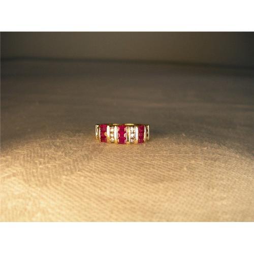 You are looking at a beautiful estate 14K yellow gold band with rubies and diamonds. This uniquely styled piece features 9 natural baguette rubies, each measuring almost 3 mm long by 2 mm wide and 12 brilliant round diamonds, each measuring 1 mm in diameter. The top of the band is 1/4 of an inch wide. The ring is a size 7. Sizing is available. It weighs 4.7 grams. It is in mint condition.