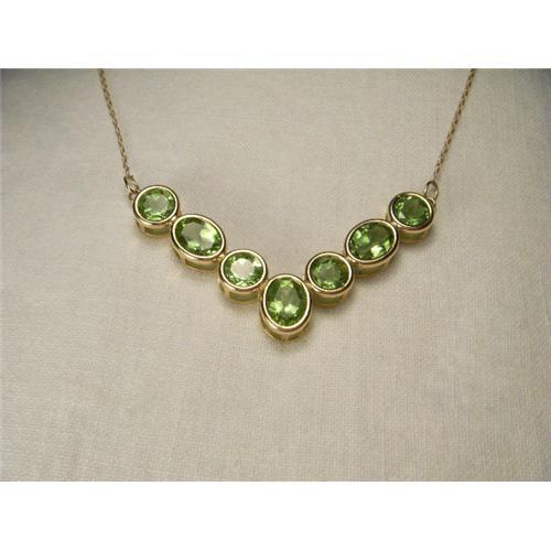 You are looking at an estate 14K yellow gold peridot necklace. This beautiful piece features 4 natural round peridots measuring 5 mm each alternating with 3 natural oval peridots measuring 7 mm by 5 mm each. The chain measures 18 inches long and has a generic clasp. The pendant part measures 1 and 7/8 of an inch long by 1 and 1/4 of an inch wide. The necklace weighs 4.1 grams. It is in mint condition.