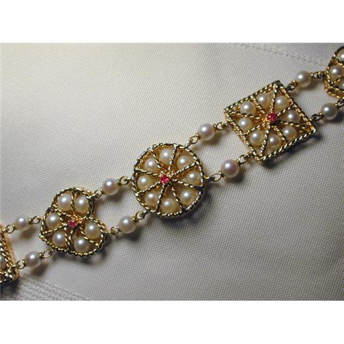 You are looking at a beautiful estate 14K yellow gold and cultured pearl bracelet. There are 56 cultured pearls laid out in a filigree gold design of squares, hearts and circles. There is a natural ruby in a center of each section. The bracelet measures 8 inches long by about .75 of an inch wide. It weighs 34.8 grams. It is in mint condition.