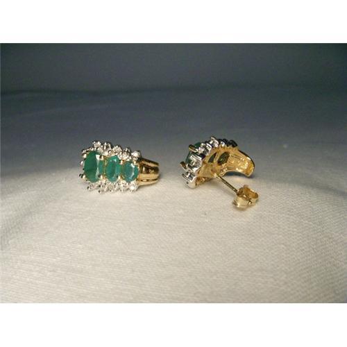 You are looking at a pair of estate 14K yellow gold emerald diamond earrings. Each earring features 3 natural oval emeralds measuring 6 mm by 4 mm, 5 mm by 3 mm and 4 mm by 3 mm. Each piece also features 7 brilliant round diamonds measuring just under 1 mm in diameter each. Each earring measures 5/8 of an inch long by 3/8 of an inch wide. The pair weighs 4.1 grams. They are in mint condition.