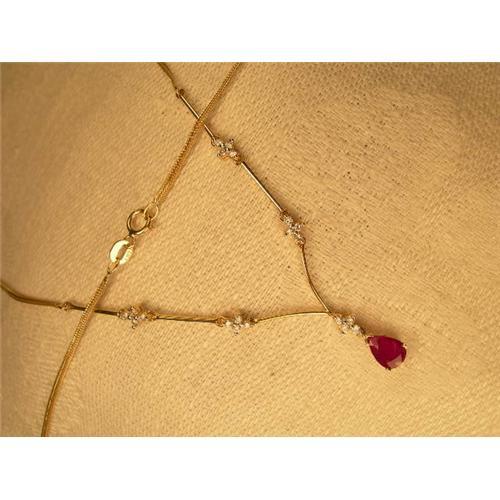 You are looking at a beautiful estate 14K yellow gold ruby and diamond necklace. This lovely piece features one natural tear drop ruby measuring 7 mm long by 5 mm wide and 20 brilliant round diamonds, each measuring 1 mm in diameter. The total weight of the diamonds is .20 of a carat and the weight of the ruby is .85 of a carat. The necklace is 17 inches long. It weighs 3.8 grams. It is in mint condition.