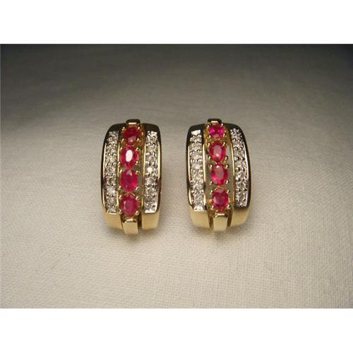 You are looking at a pair of estate 14K yellow gold ruby and diamond huggie earrings. Each beautiful piece features 4 natural oval rubies measuring 4 mm by 3 mm and 14 brilliant round diamonds each measuring 1 mm in diameter. The total weight of the diamonds is .28 of a carat. Each earring measures 7/8 of an inch long by 3/8 of an inch wide. The pair weighs 8.1 grams. They are in mint condition.