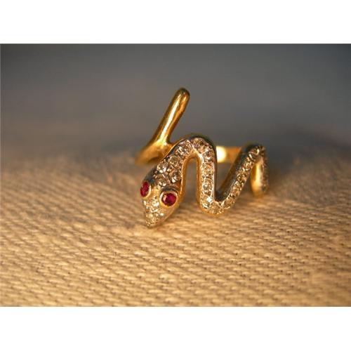 You are looking at a rare estate 14K yellow gold snake ring. There are 2 natural round rubies as the eyes and 25 brilliant round diamonds encrusting the body of this snake. The top of the ring measures 5/8 of an inch wide. The ring is a size 6. Sizing is available. It weighs 3 grams. It is in mint condition.