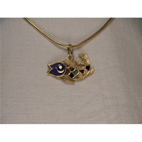 You are looking at an estate 14K yellow gold enamel fish pendant/charm. This beautiful piece features gold fish body with red, blue, and greed enamel scales. The pendant measures one inch long by 1/2 of an inch wide. It weighs 1.8 grams. It is in mint condition.